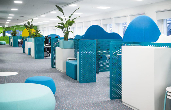 4、動漫公司辦公室裝修:以一個開放式的辦公環境為宗旨,旨在培養員工的團隊協作能力和溝通能力,而隨處可見的沙發座椅大大方便了員工之間的溝通交流。放松心情的辦公氛圍也使得靈感隨時都有可能迸發,公司員工能夠享受到以任何自己喜歡的方式進行靈感的創作。除了主要的工作區域,辦公室的其他功能區也各具特色。以天然綠色為背景的圖書館能夠為員工提供寧靜安逸的閱讀空間,另外還有包括蹦床、球類等讓員工可以盡情玩樂游戲室,閑暇之余聊天放松的咖啡廳。而餐廳的設計有吸引力,將餐廳設計成一個復古的美式游樂園,搖椅或旋轉木馬般的座位,極具童心童趣。